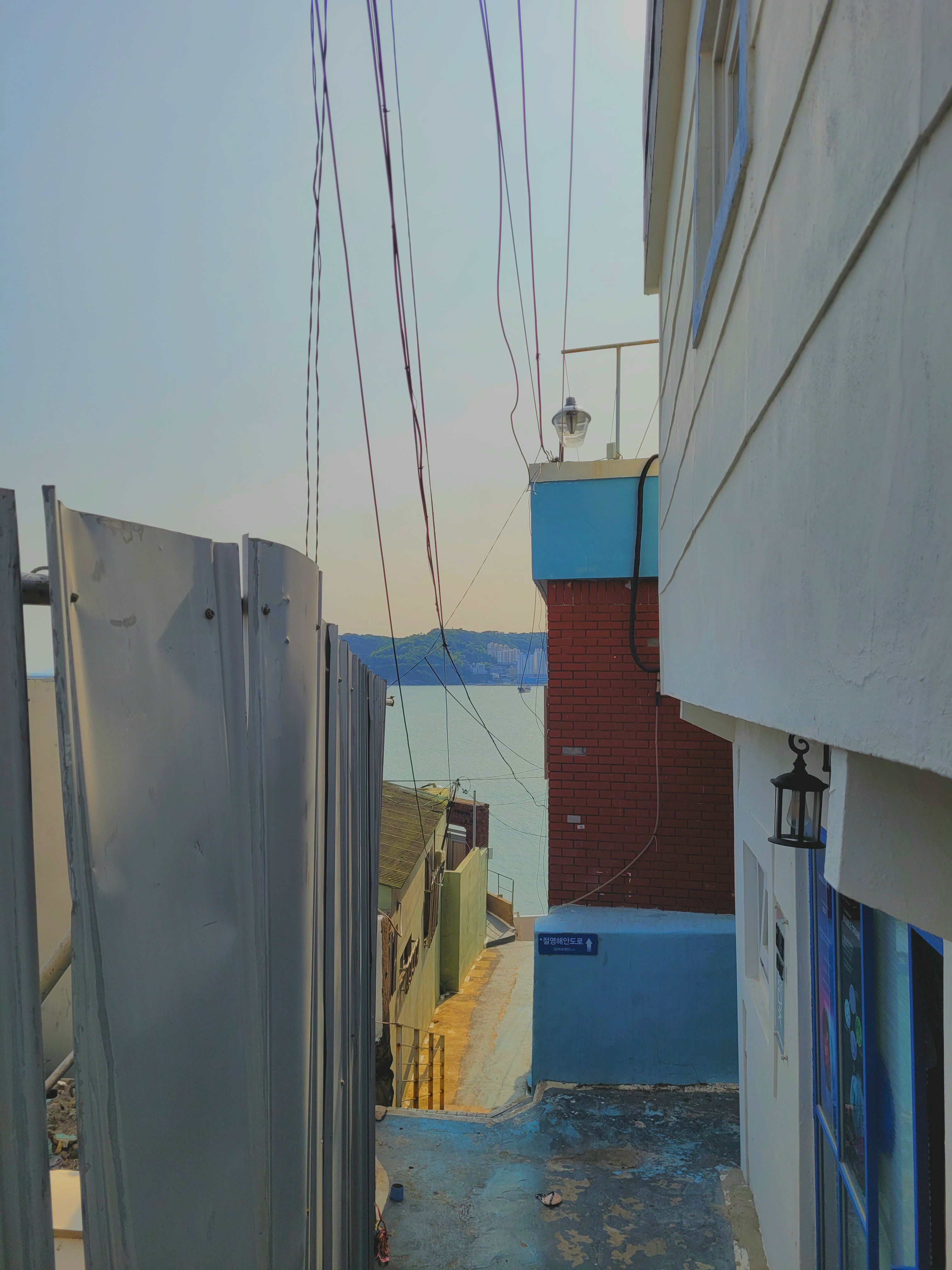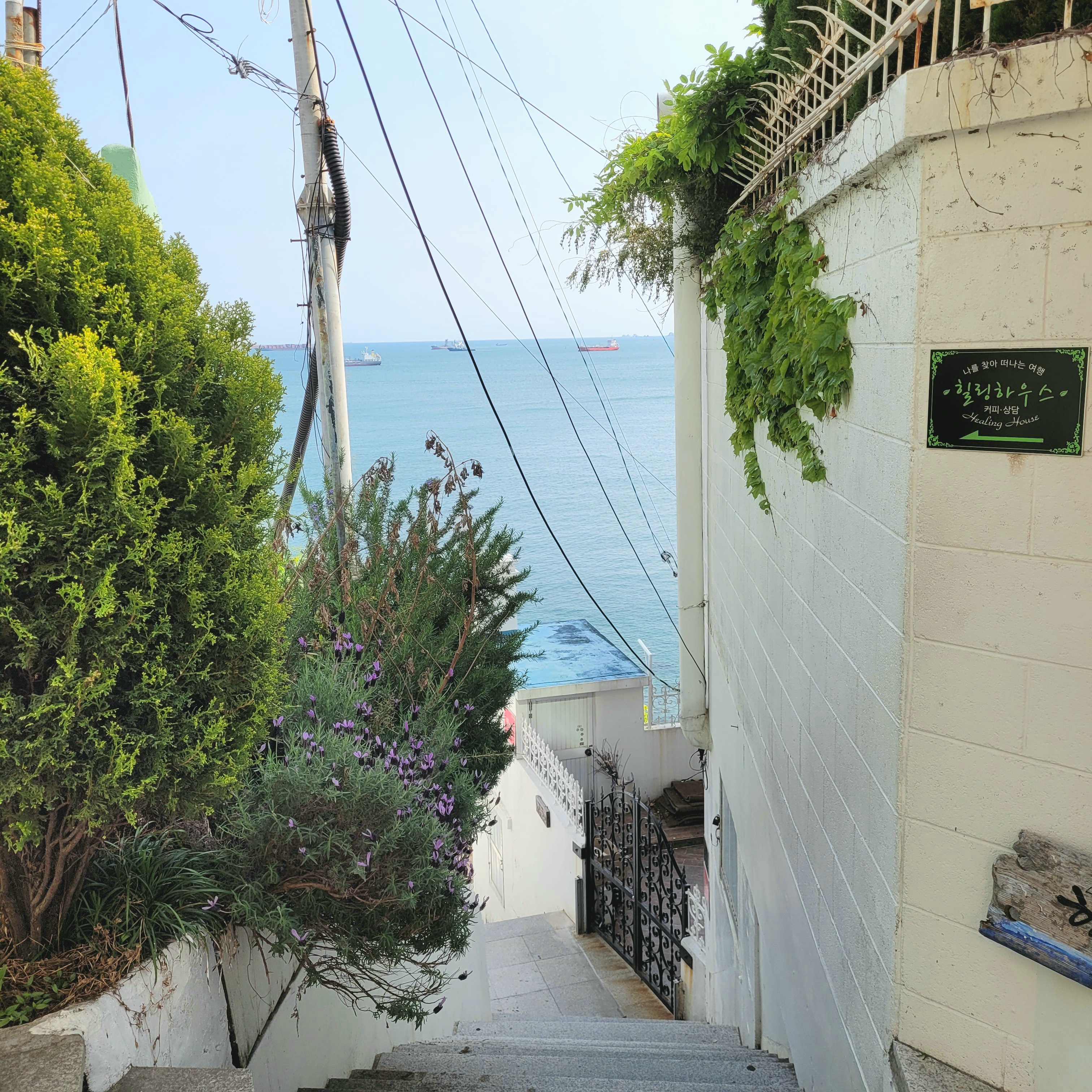 흰 벽, 보라색 꽃, 그리고 계단 끝에서 만나는 바다까지 갓벽해요-